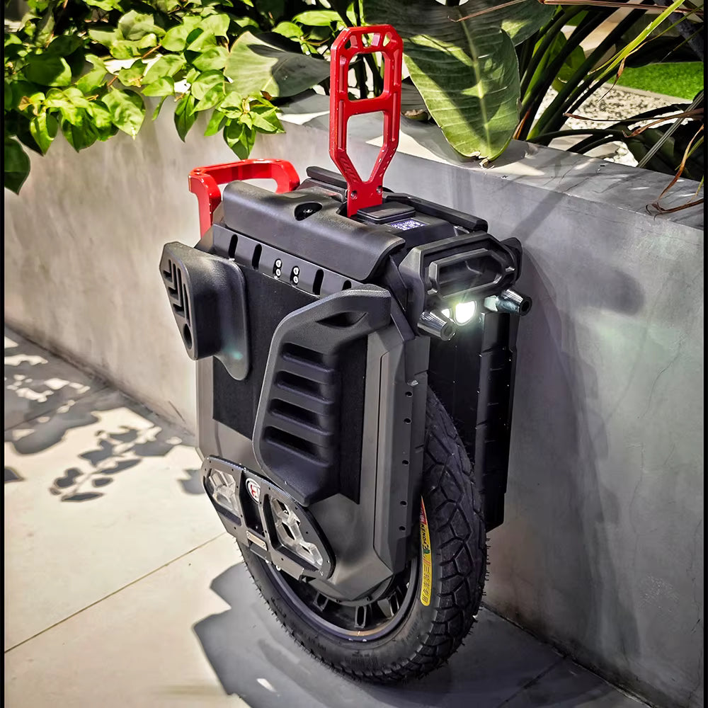 Enhjulingen är byggd för att tåla tuff användning. Med en vikt på 43 kg och en IP54-klassning är den skyddad mot vattenstänk och damm – perfekt för svenska förhållanden. Den robusta konstruktionen kombineras med genomtänkta detaljer som inbyggt bärhandtag fram och bak, vikbar trolley-funktion, samt CNC-tillverkade pedaler och sidoskydd för ökad komfort och kontroll.